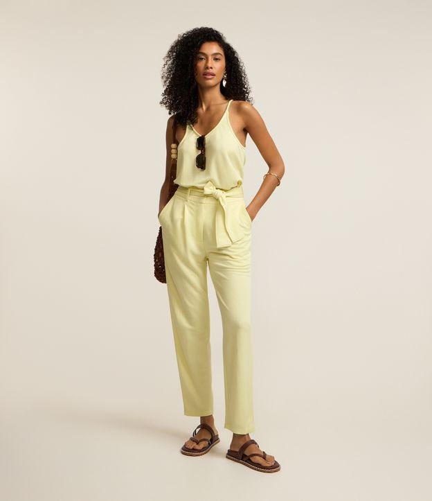 Calça feminina confeccionada em piquet, de modelo cenoura, com pregas na parte da frente e faixa para amarração na cintura.