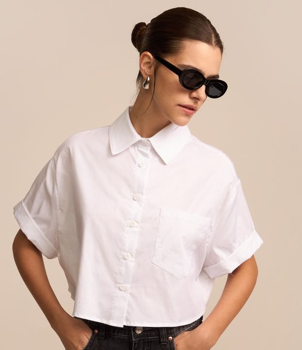 Camisa Cropped em Tricoline com Bolso e Manga Dobradinha