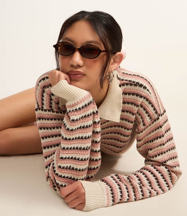 Blusa em Tricô Texturizado com Listras e Botões Rosa