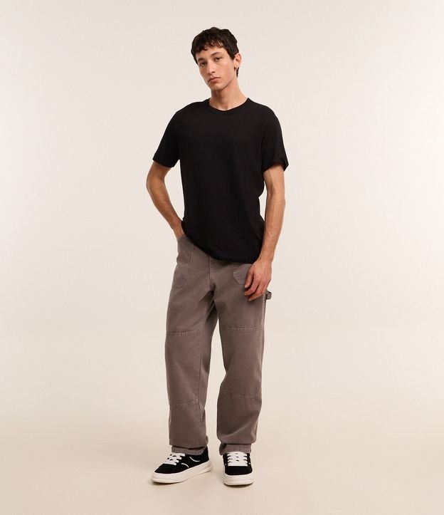 Calça masculina confeccionada em sarja de material mais sustentável. De modelo baggy, com passantes no cós, bolsos e lavagem marmaorizada.