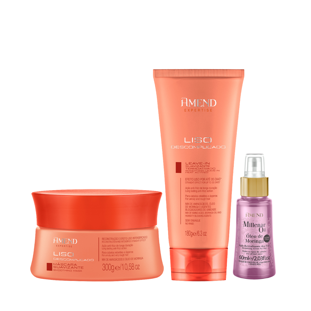 Sobre o Amend Expertise Liso Descomplicado Masc 300ml + Leave-in 180ml + Millenar Oil Moringa 60ml