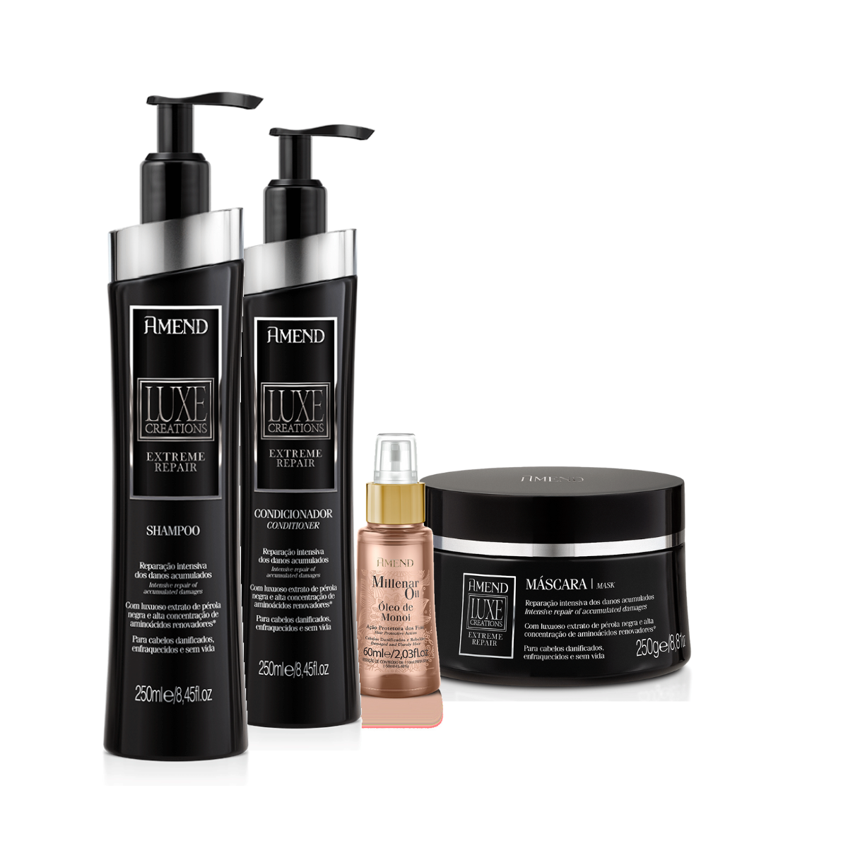 Amend Luxe Creations Extreme Repair Sh 250ml + Cond 250ml + Masc 250ml + Millenar Oil Monói 60ml ÚNICO