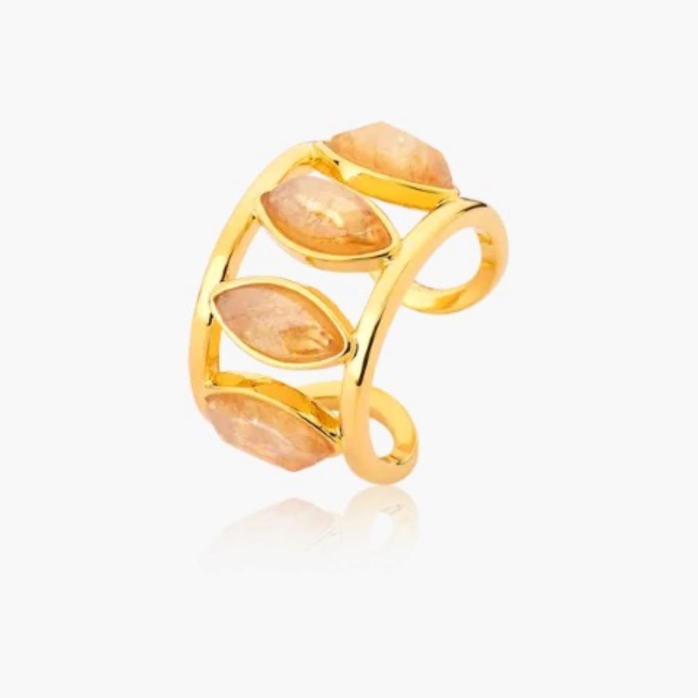 Anel ANIA STORE com Quatro Pedras em lapidação navete na pedra natural brasileira Citrino na parte superior e base Dourada. Semijoia Banhada a Ouro 18k, que proporciona ajuste no tamanho. Acessório moderno e marcante, ideal para qualquer ocasião do dia ou da noite. Citrino é a pedra do sucesso, da abundância e da prosperidade. Diretamente ligada ao sol, traz força, coragem e auto valorização.