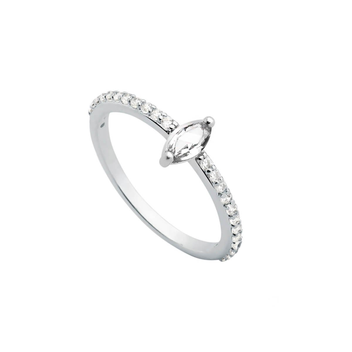 Confeccionado em Prata 925, esse anel solitário possui um aro de espessura média cravejado de zircônias e uma pedra de zircônia transparente em formato de losango no topo.