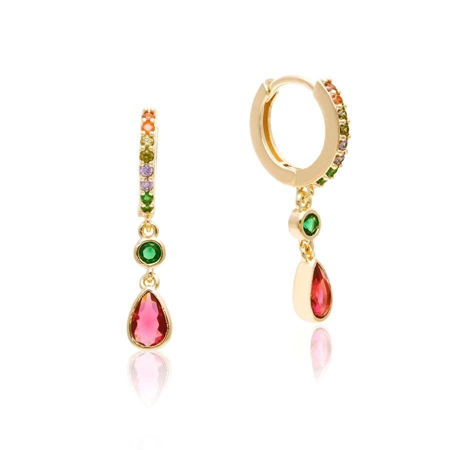 Argola Cristais Coloridos Pingente Vermelho Rubi Semijoia Dourado
