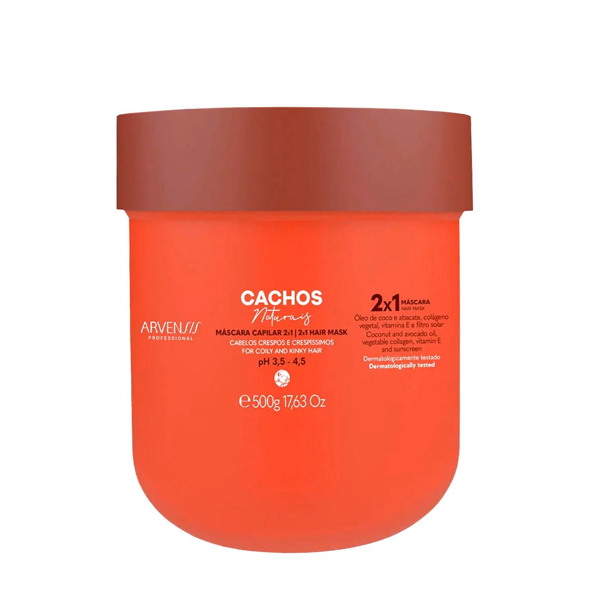 Arvensis Cachos Naturais 2x1 No Poo - Mascara Capilar 500g Para cabelos cacheados e crespos. Multifuncional, hidrata profundamente os fios, ao mesmo tempo, em que age como um finalizador potente. Com protecao solar e enriquecido com oleos umectantes nobres, proporciona cachos macios, definidos, sem frizz, soltos e com balanco natural.