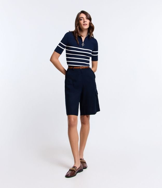 Bermuda Alongada em Viscolinho com Bolso Lateral Azul Marinho