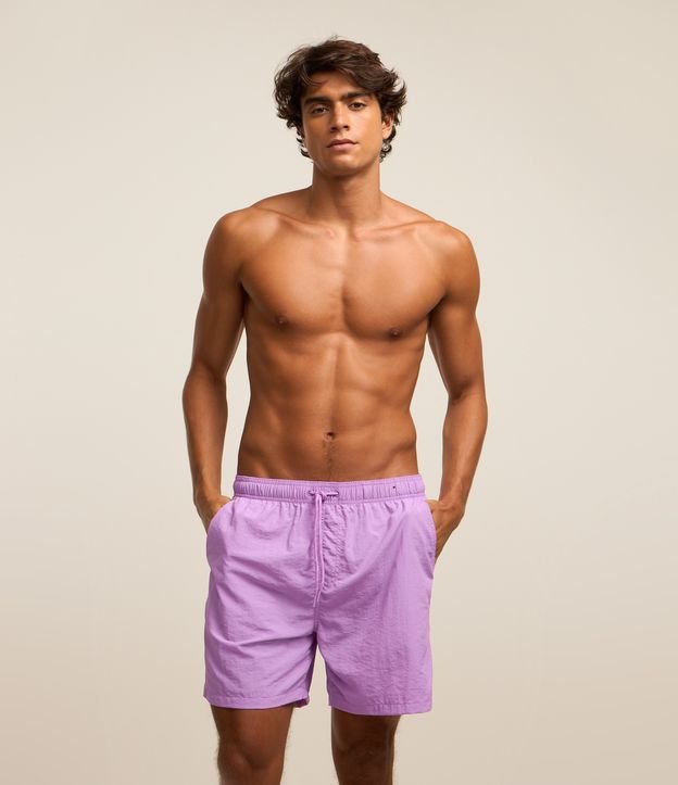 Bermuda básica, confeccionada em microfibra leve, cós elástico com cordão para ajuste e fenda nas laterais da barra.
