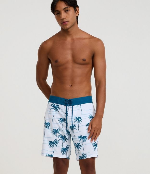 Bermuda de Banho em Microfibra Leve com Estampa Tropical de Coqueiros Praianos Branco