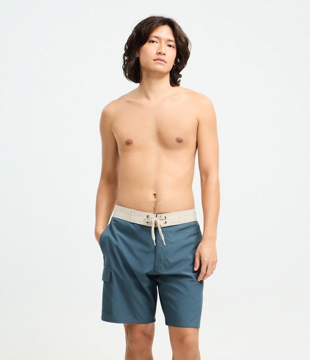 Bermuda de Banho Lisa com Fita nas Laterais e Patch Localizado Azul