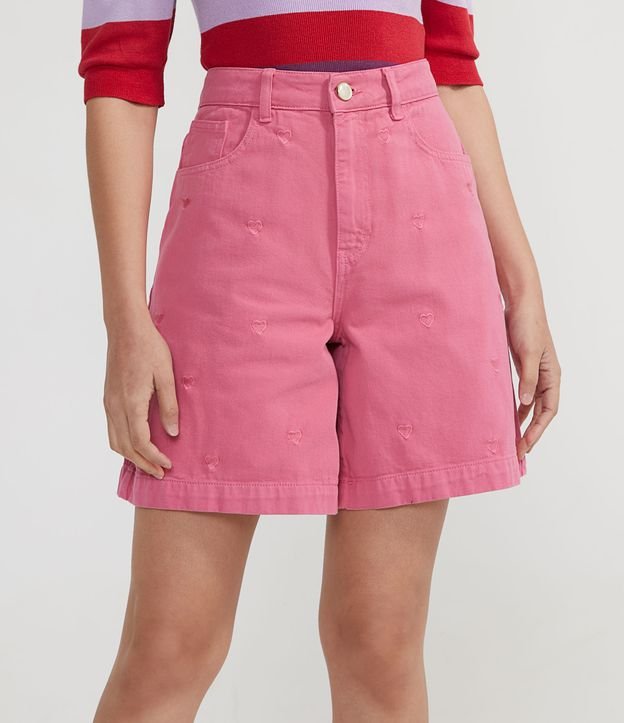 Bermuda em Sarja Alongada com Bordado de Mini Corações e Botão Madre Pérola