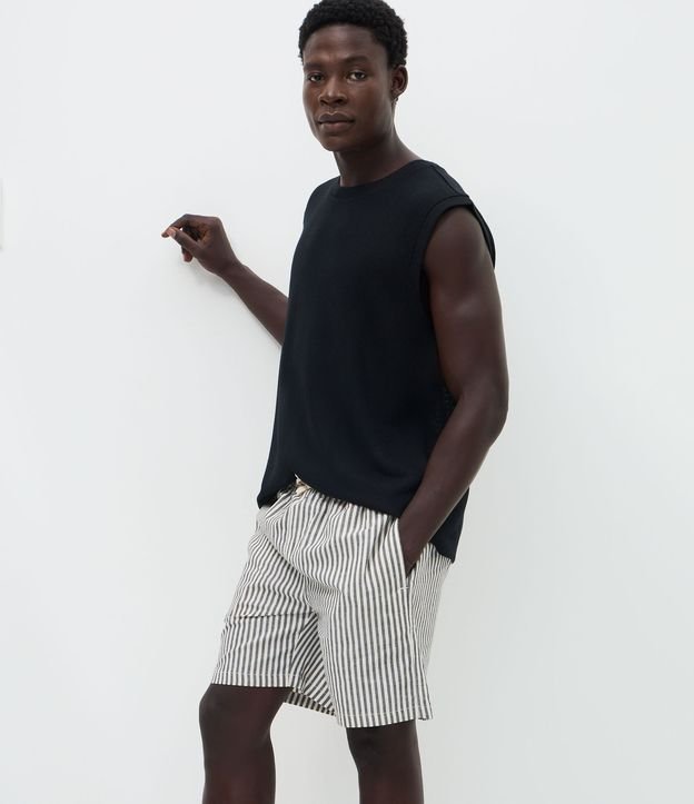 Bermuda masculina em sarja de algodão certificado bci confeccionada em boas praticas ambientais, produto com cós elástico, amarração, estampa listrada e bolsos.
