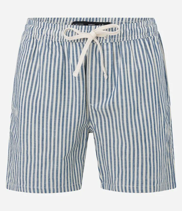 Bermuda masculina em sarja de algodão certificado bci confeccionada em boas praticas ambientais, produto com cós elástico, amarração, estampa listrada e bolsos.