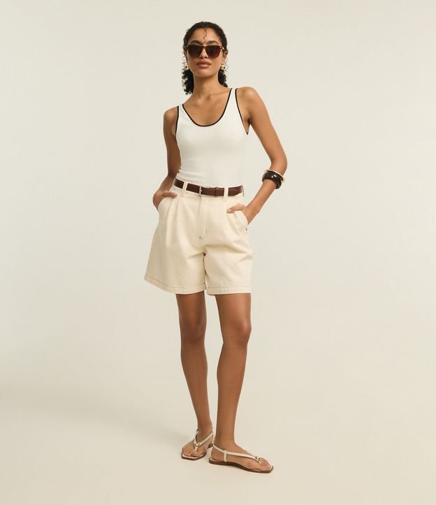Bermuda em Sarja com Pregas e Costura Contrastante Off White
