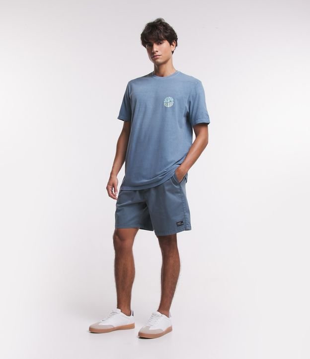 Bermuda regular masculina, confeccionada em sarja lavada, com amarração no cós e bolsos.