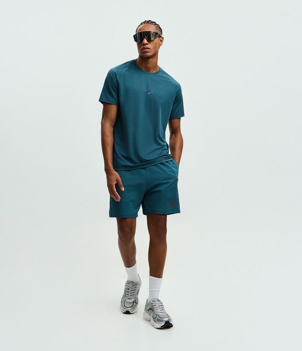 Bermuda masculina confeccionada em tecido tecnológico, cós elástico com cordão ajustável, bolso com fechamento em zíper.