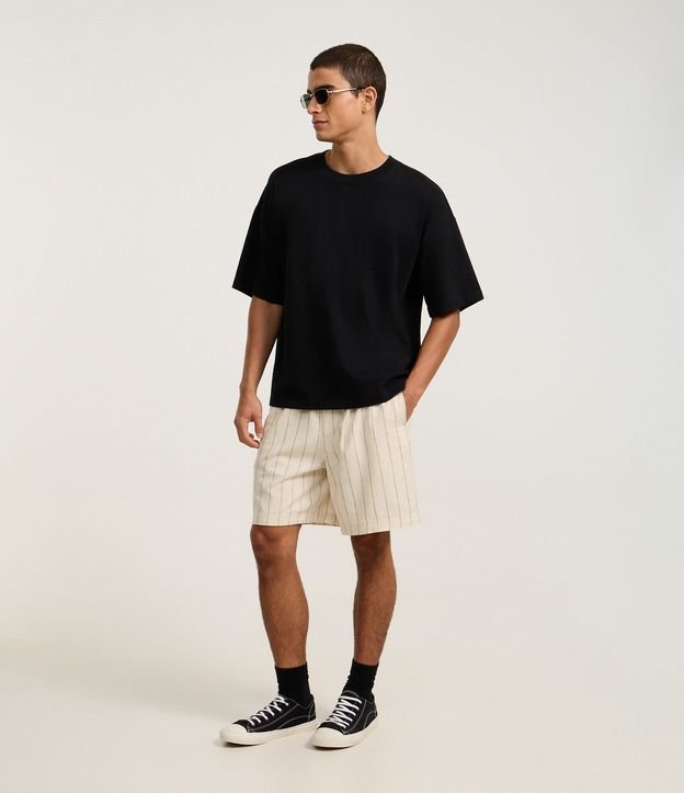 Bermuda masculina confeccionada em tricoline mais sustentável. Possui cós elástico, com cordão ajustável, bolso e estampa de listras rústicas.