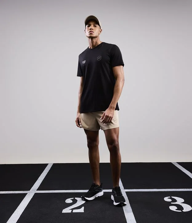 Bermuda esportiva masculina confeccionada em poliéster com elastano. Possui cós elástico, com cordão, ajustável, contrastante, lettering lateral e detalhe refletivo traseiro.
