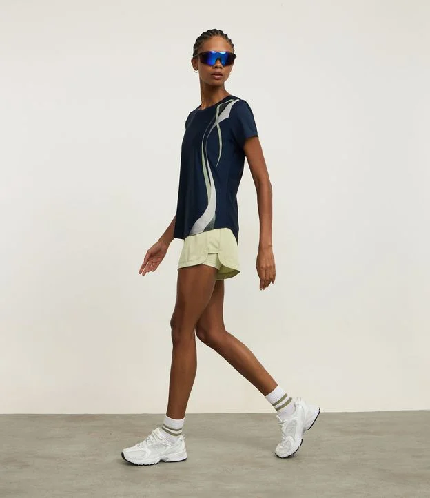 Bermuda esportiva feminina confeccionada em microfibra. Possui modelagem dupla, com short interno ajustado para maior segurança e camada externa solta que garante liberdade de movimentos. Apresenta cós alto e largo em mesh respirável, barra arredondada, recorte frontal e bolso funcional no short interno, ideal para guardar pequenos objetos. Perfeita para atividades físicas e uso esportivo casual.