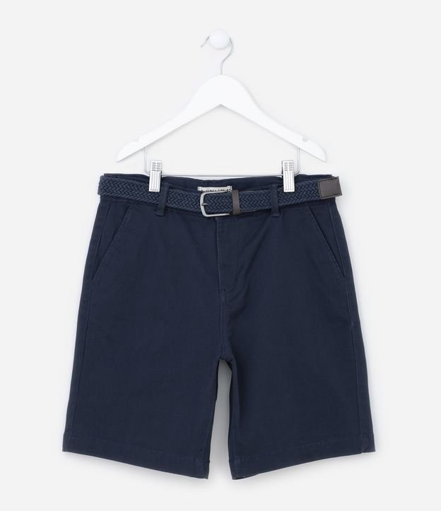 Bermuda infantil confeccionada em sarja com passantes e cinto de textura trançada afivelado na cintura com bolsos.