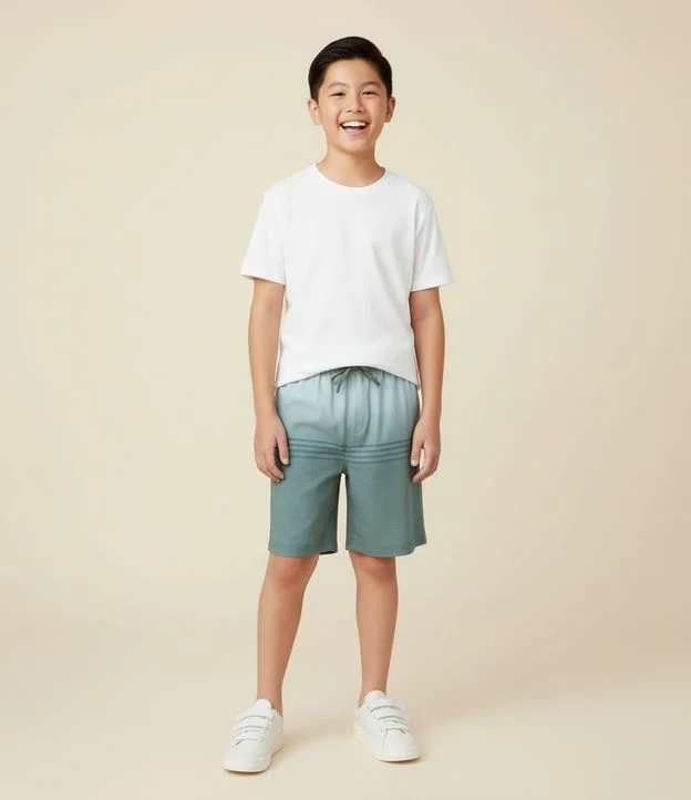 Bermuda infantil confeccionada em poliéster, no modelo de banho. Possui cós elástico, com cordão, bolso, estampa degradê e listras.