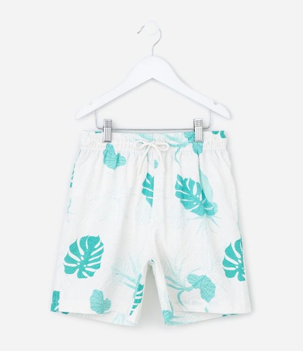 Bermuda Infantil de Banho em Anarruga com Estampa de Folhagens - Tam 5 a 14 Anos Branco