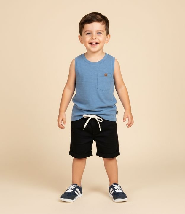 Bermuda infantil confeccionada em algodão certificado BCI e boas práticas ambientais, garantindo resistência e conforto. Possui cós com amarração, bolsos laterais e traseiro e barra dobrada, perfeita para looks casuais e estilosos.