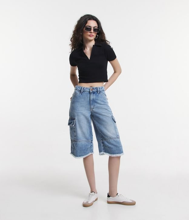 Bermuda Jeans com Bolso Cargo e Joelheira