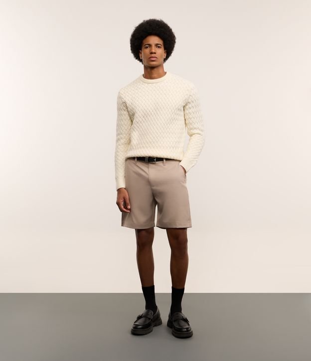 Bermuda masculina confeccionada em sarja, no modelo reto. Possui cós com passante, fechamento tradicional, sem estampa e com bolso.