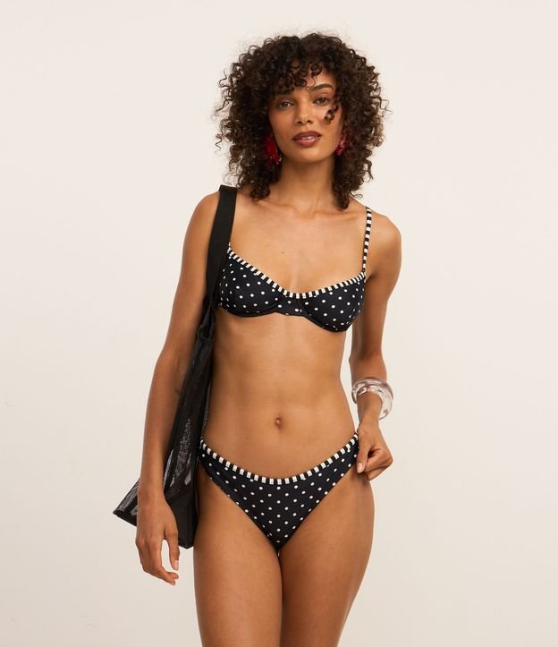 Peça avulsa de biquíni confeccionada em microfibra estampada de bolinhas. A calcinha asa delta tem cós contrastante e efeito empina bumbum.