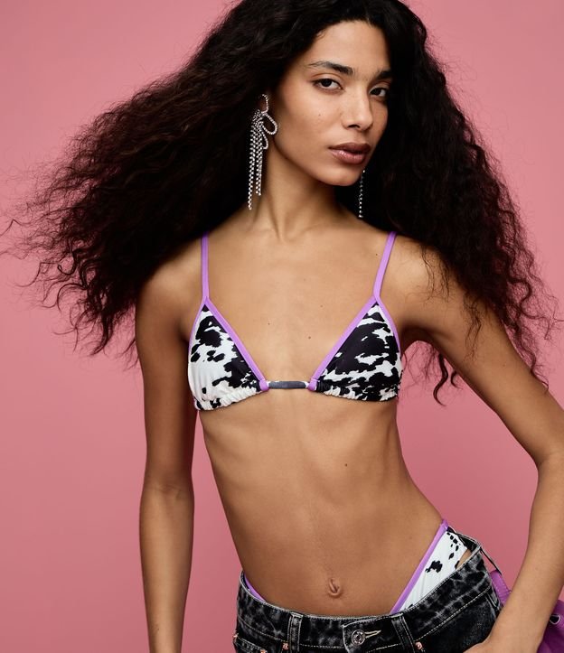Biquini top feminino confeccionado em microfibra. Possui modelo cortininha, alças finas, reguladores metálicos, amarração frente e costas, decote em v, estampa animal print com viés contrastantes.