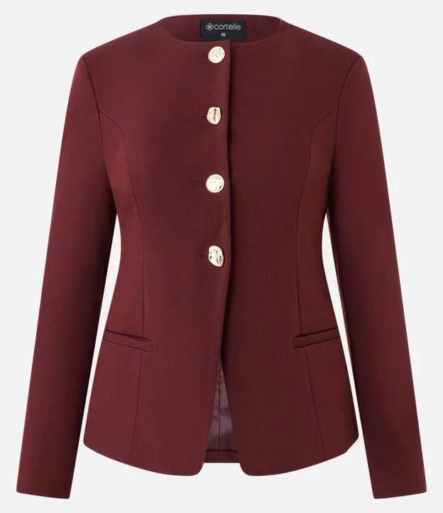 Blazer feminino de alfaiataria com modelagem estruturada. Possui gola redonda, abotoamento frontal, bolsos embutidos, recortes que definem a silhueta e mangas longas ajustadas.