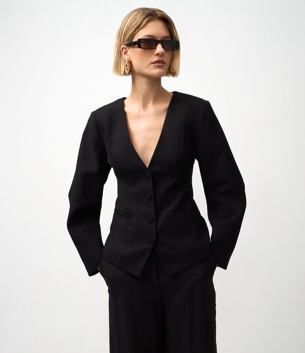 Blazer Alfaiatado com Corte Acinturado e Mangas Balloon Preto