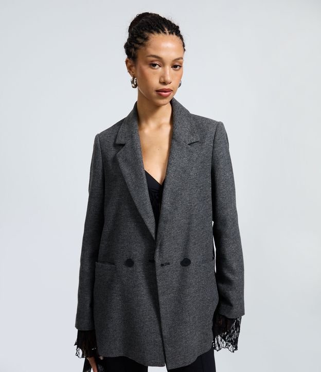 Blazer Alongado em Polivelour Xadrez com Botões Cinza