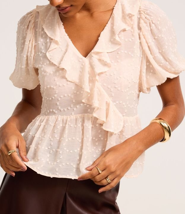 Blusa de corte alfaiatado e mangas curtas bufantes, confeccionada em tecido com efeito pulmetis, com decote V com babado transpassado e recorte na barra. Plumeti é um tipo de tecido com textura bastante delicada e que, normalmente, tem aplicações de pontinhos bordados. Este produto foi fabricado através de processos mais sustentáveis, adotando boas práticas ambientais.