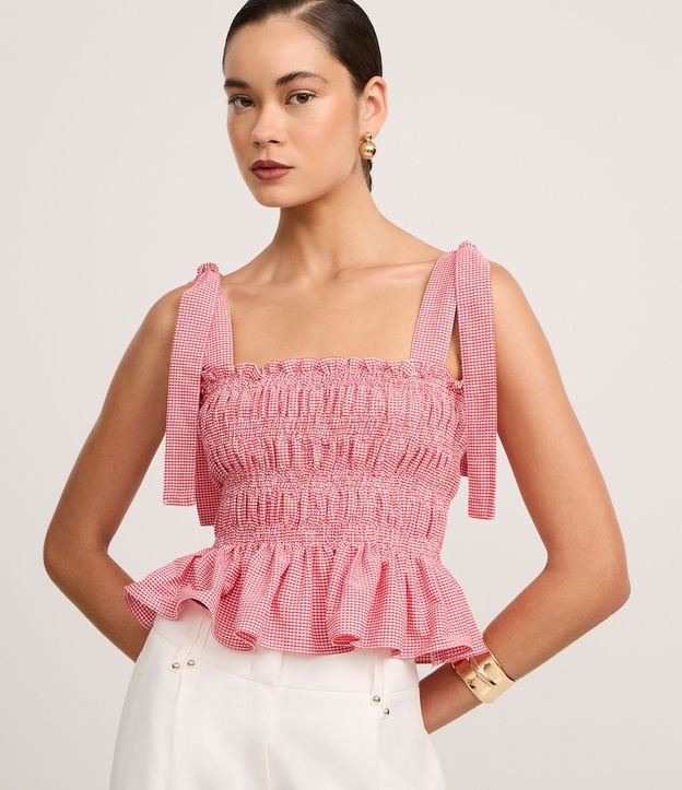 Blusa Alfaiatada Xadrez com Amarração na Alça Rosa