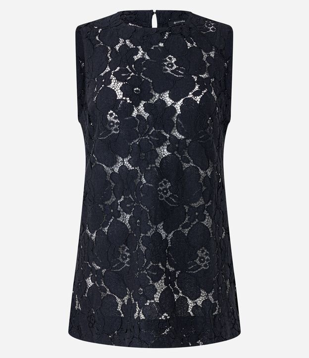 Blusa feminina de modelo alongada, confeccionada em renda floral, sem mangas.