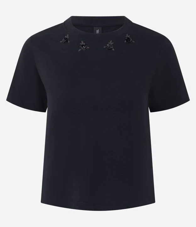 Blusa Baby Look com Bordado de Florzinhas no Decote Preto