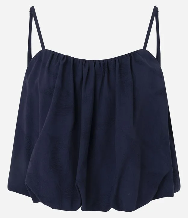 Blusa Balonê em Jacquard Floral com Alças Finas Reguláveis Azul