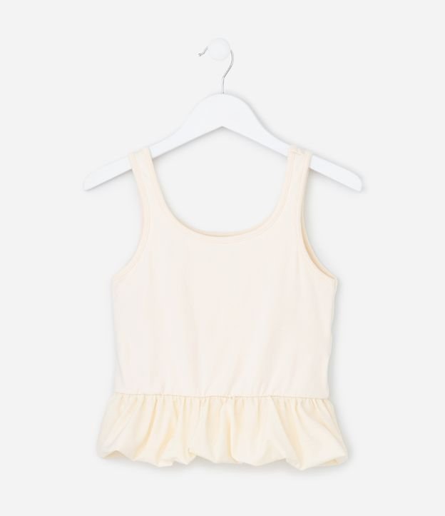 Blusa infantil de alças médias, sem mangas, sem estampa e com detalhe de barra balonê. A peça é confeccionada em ribana com boas práticas ambientais e algodão certificado bci.