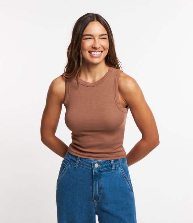 Blusa básica feminina, modelo regata cropped, confeccionada em ribana de viscose. Sem estampa, possui textura caneladinha.