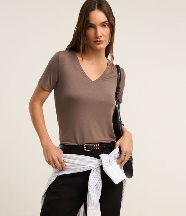 Blusa confeccionada em viscose, com mangas curtas e gola V. Peça sem estampa, curinga para montar diversos looks! Este produto possui viscose certificadoa em sua composição, além de ter sido produzido através de processos mais sustentáveis, sendo ambientalmente mais responsável.