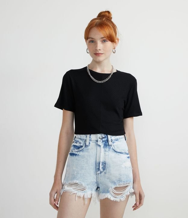 Blusa Básica em Viscose Texturizada com Manga Curta e Recorte Frontal