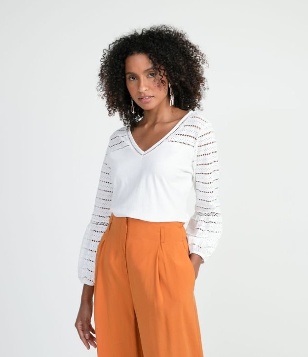 Blusa Bata em Algodão com Detalhes em Laise e Entremeios