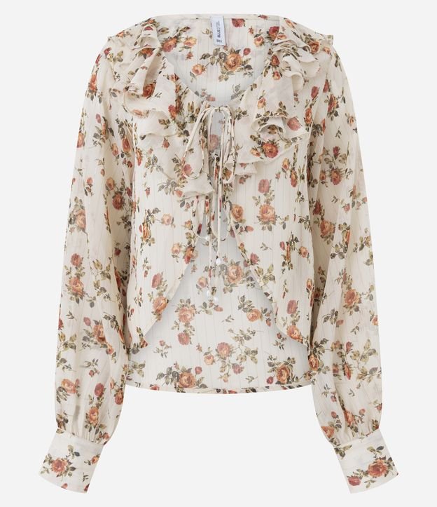 Blusa Bata em Chiffon com Babados no Decote e Estampa Floral Bege