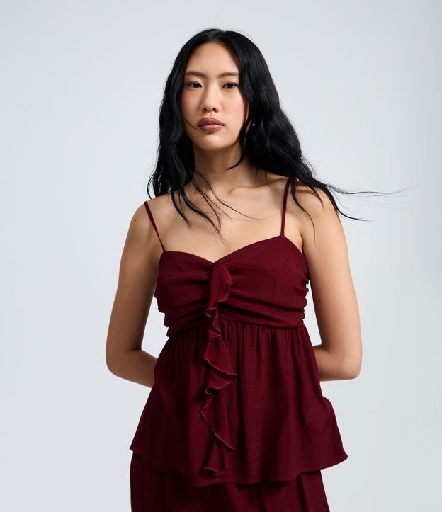 Blusa Bata em Crepe com Busto Franzido e Babado Frontal Vinho