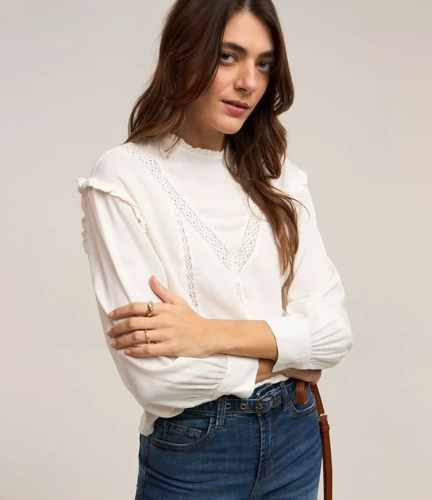 Blusa Bata em Viscose Maquinetada com Detalhes de Frufru e Entremeios Branco Neve