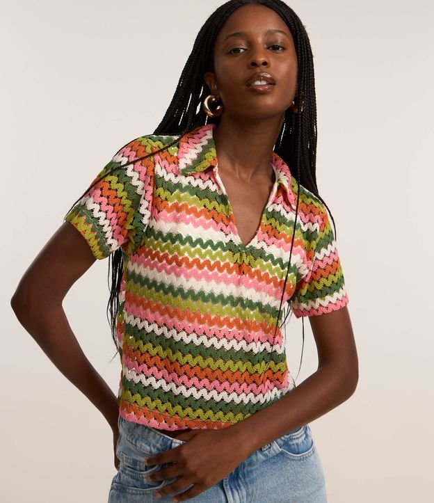 Blusa Boxy com Gola Polo em Tricô Verde/Rosa/Laranja