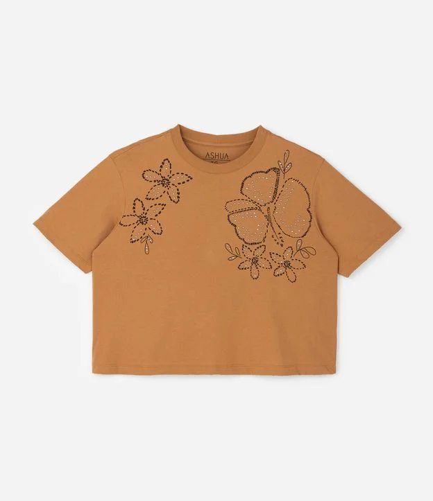 Blusa plus size feminina confeccionada em algodão, com gola redonda e mangas curtas. Possui modelo boxy, estampa floral frontal e aplicação de tachinhas.