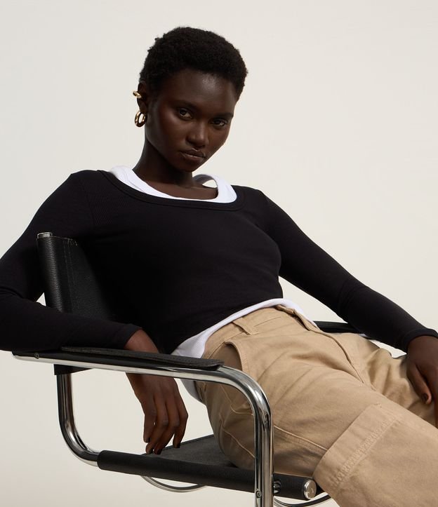 Blusa feminina curta, confeccionada em ribana de viscose, com decote redondo profundo e mangas longas. sem estampa, possui textura caneladinha.